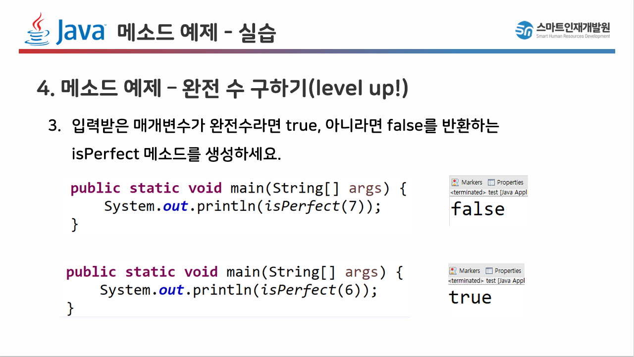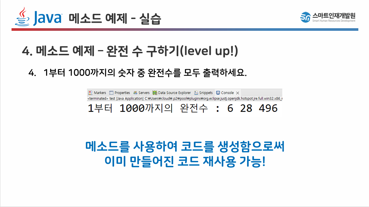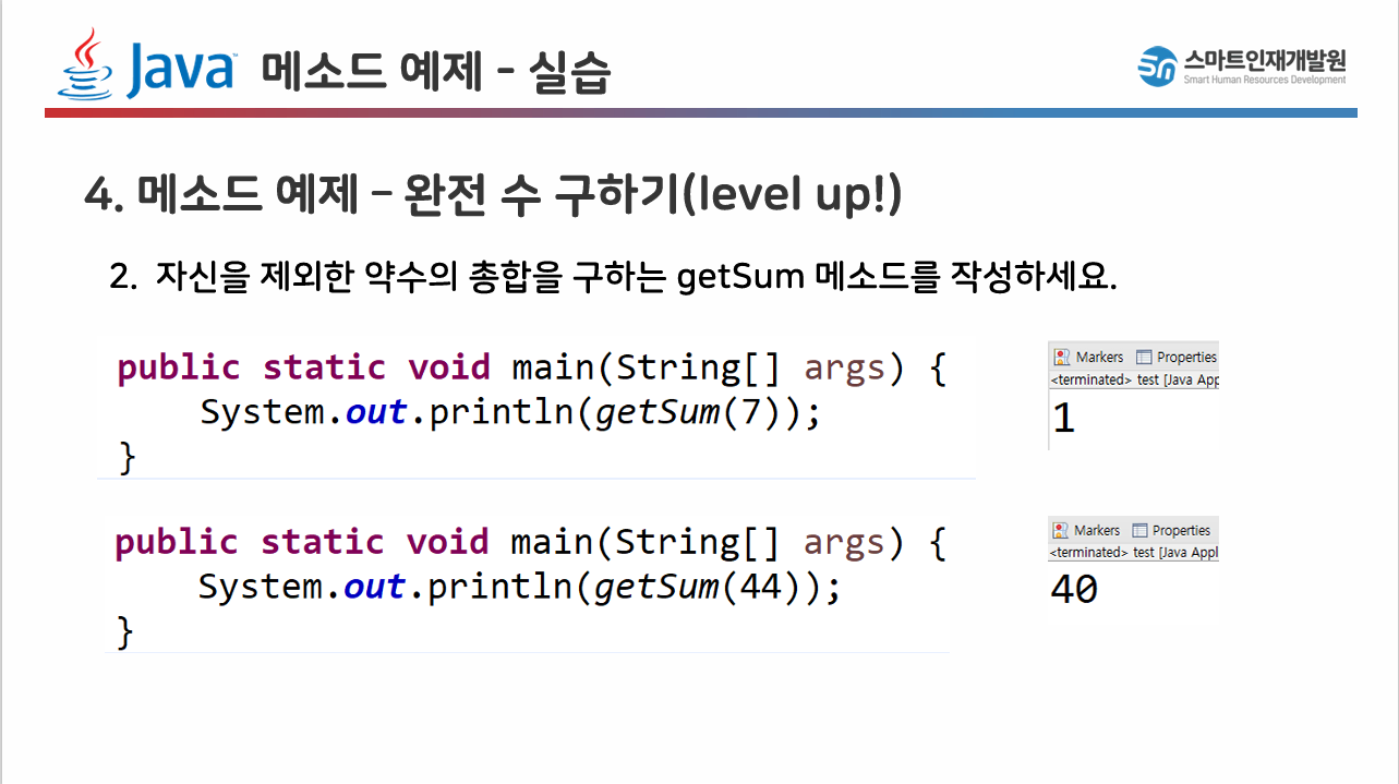 이는 메소드에서 다른 메드를 호출 가능하다는 것을 알려주는 문제입니다. 우리는 미리 만들어 놓은 약수를 구하는 기능을 getSum에서 호출해서 사용한 것입니다.