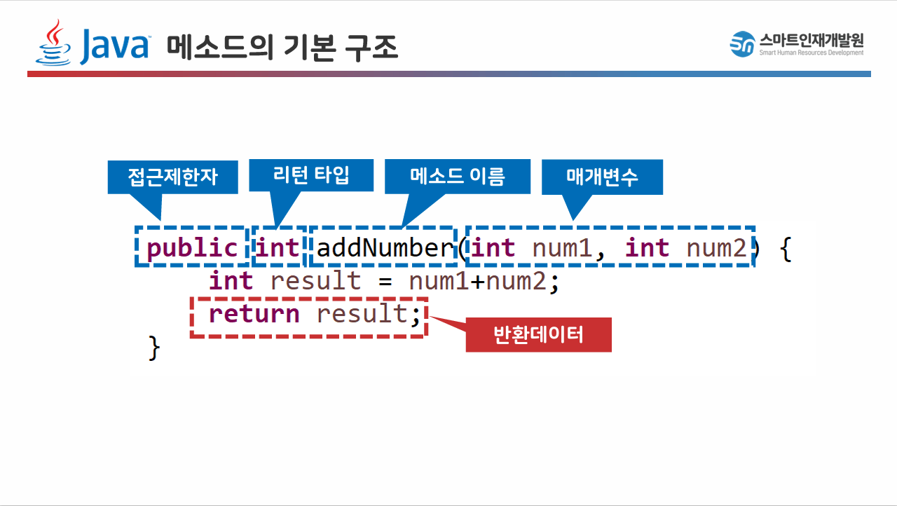 - 접근제한자, 리턴타입, 메소드 이름, 매개변수로 구성