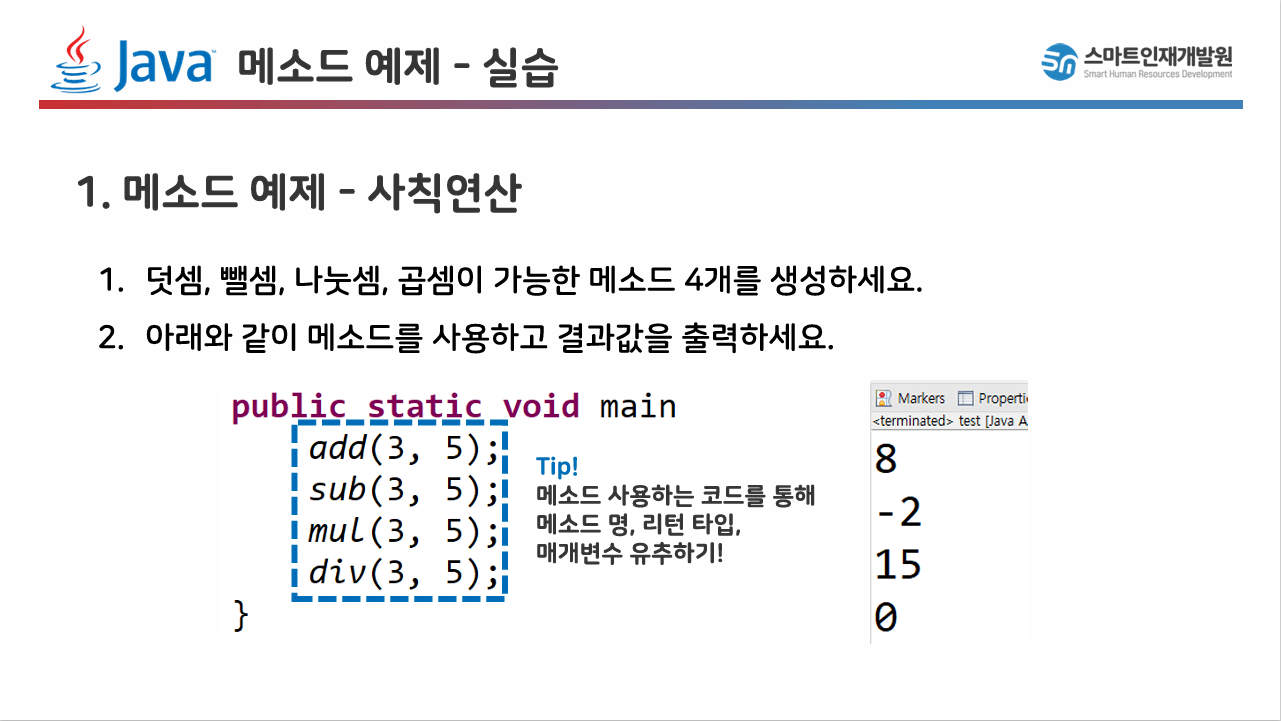 제어문, 반복문에 이어 계속 중요한 것이라고 말씀을 드리고 있는데, 메소드도 실제로 Java에서 많이 사용됩니다. 반복되는 코드를 줄이고, 유지보수 시 가독성이나 재상용성에서 굉장히 유용합니다.