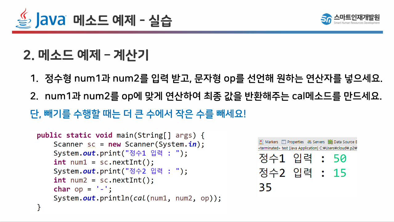 기호를 메드에서 매개변수로 받아 처리만 해주면 됩니다. 빼기 연산 시 항상 큰 수에서 작은 수를 빼도록 삼항 연산자를 사용합니다.