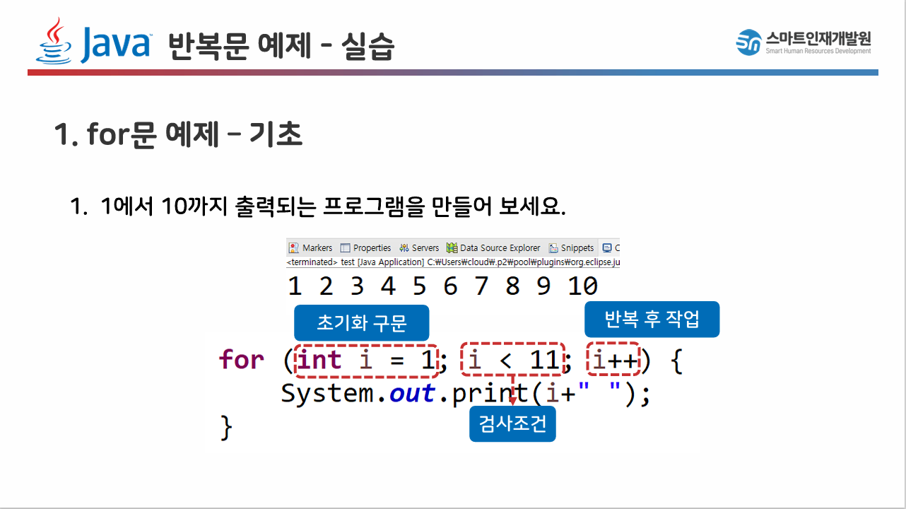 기초 예제입니다. for문의 기본 원리를 설명하고 있기 때문에 눈으로 보고 넘어가시길 바랍니다.