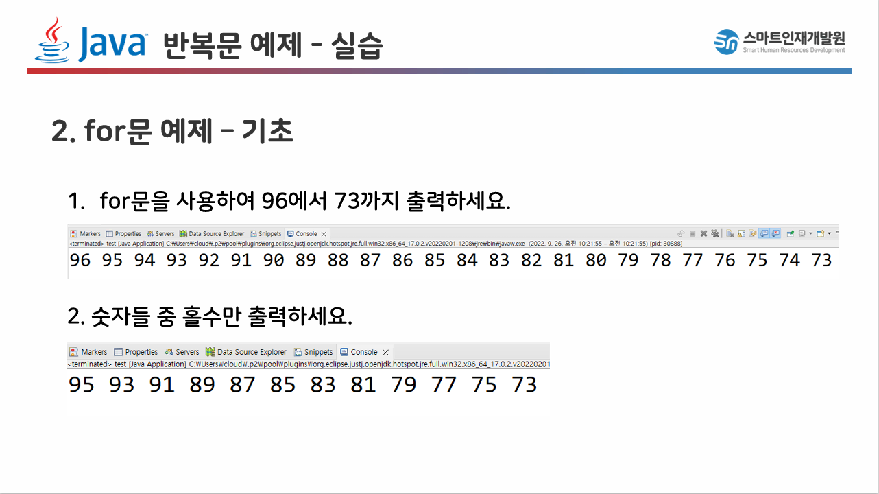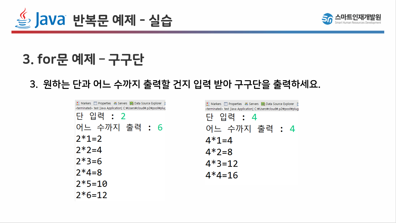 기초 예제입니다. for문의 기본 원리를 설명하고 있기 때문에 눈으로 보고 넘어가시길 바랍니다.