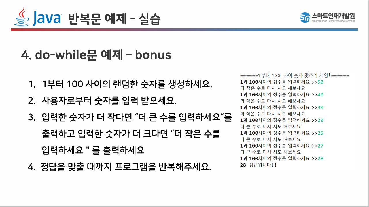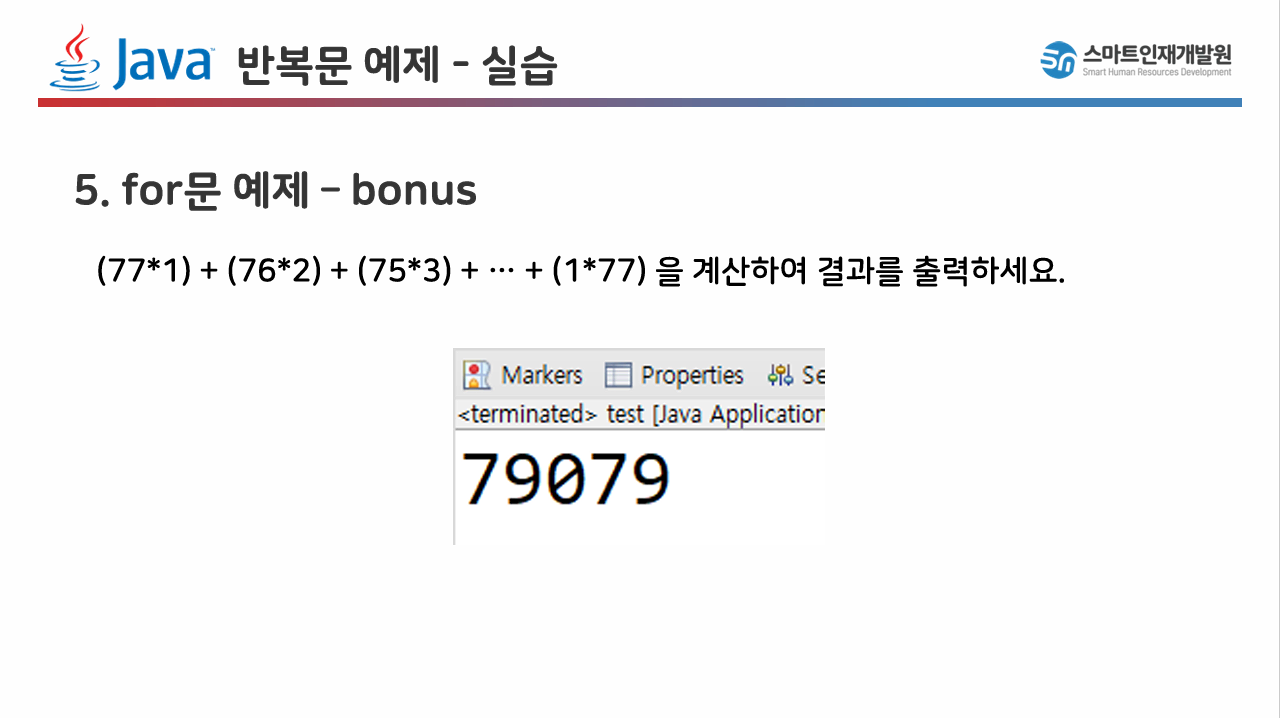 향상된 for문은 저희가 아직 배열을 배우지 않았기 때문에 배열을 배우고 난 뒤 예제에서 다루도록 하겠습니다.