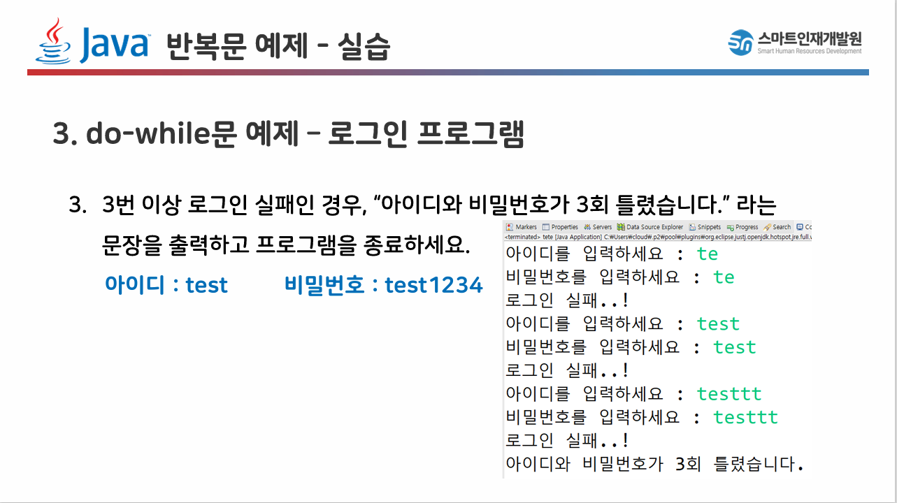 System.out.println("아이디와 비밀번호가 3회 틀렸습니다.");