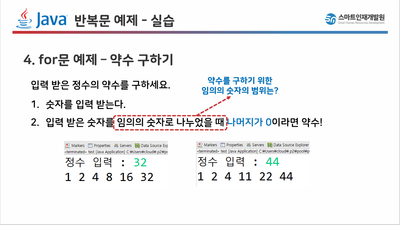 홀수, 짝수 구하는 것과 비슷한 원리입니다. 1부터 입력받은 숫자까지 반복되면서, 입력받은 수에서 1부터 반복되는 숫자 중 나눠 떨어지는 수를 구하는 겁니다.