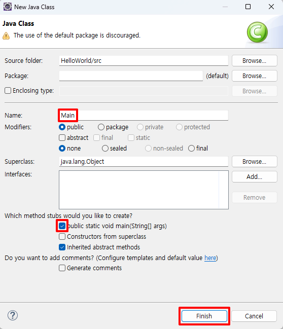 이렇게 해서 Eclipse를 이용하여 간단한 Java 프로젝트를 생성하고, 클래스를 작성한 후, "Hello, World!" 메시지를 출력하는 프로그램을 실행해 보았습니다. Eclipse의 기본 화면 구성과 각 기능을 이해하고, 새 프로젝트와 클래스를 만드는 방법을 익히면 더욱 복잡한 Java 프로그램도 쉽게 작성할 수 있습니다.