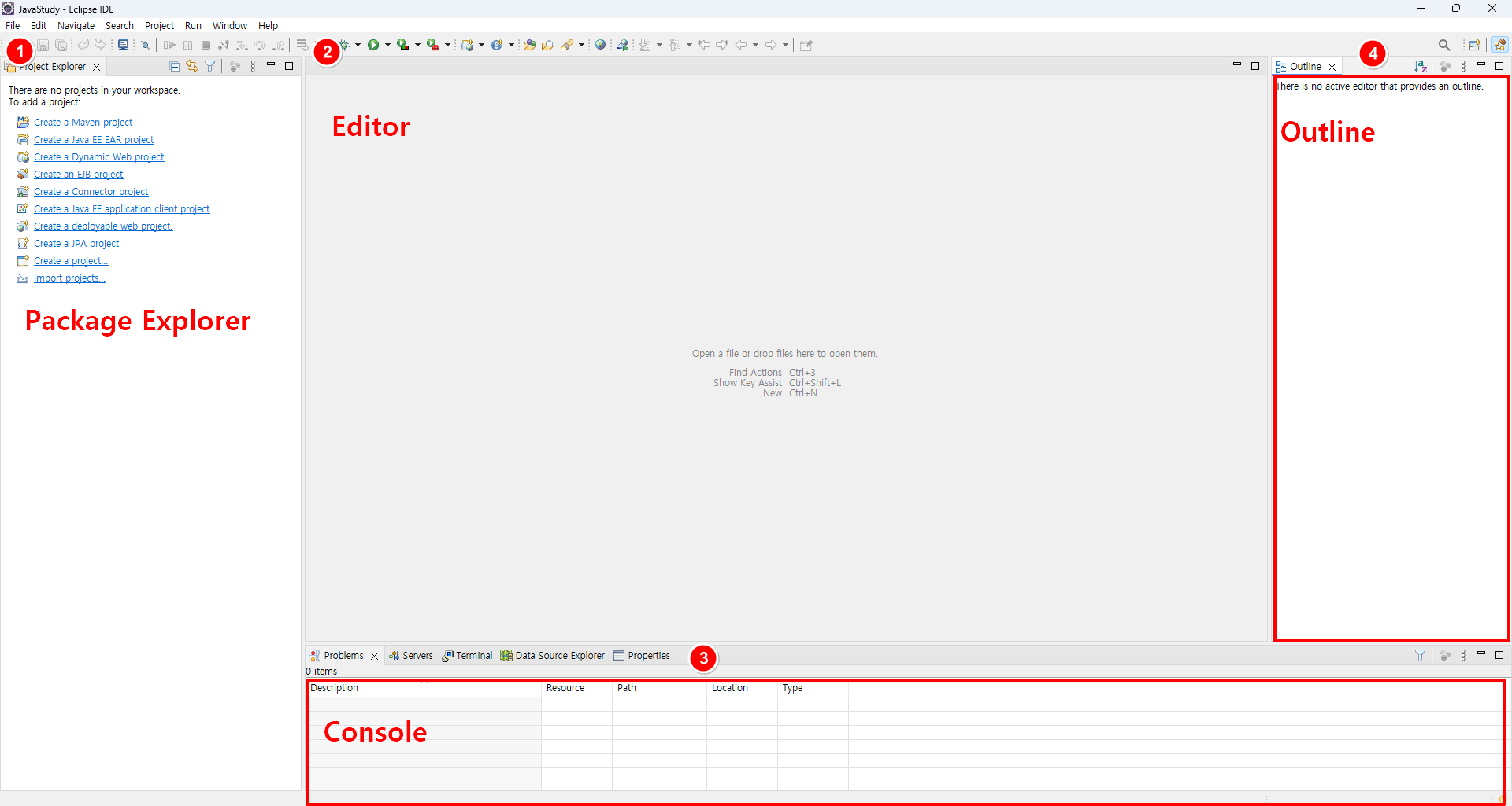 Eclipse는 자바 개발자들에게 인기 있는 통합 개발 환경(IDE)입니다. 처음 Eclipse를 실행하면 다음과 같은 주요 화면 요소들을 볼 수 있습니다.