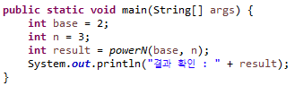 - int result = powerN(base, n);: powerN() 메소드를 호출하여 결과를 계산합니다.