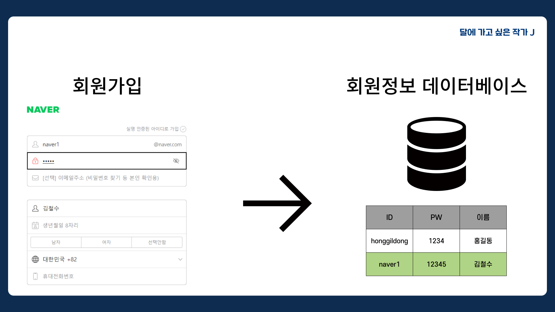 - 예제: 사용자가 웹사이트에 회원가입할 때, 입력한 이름, 이메일, 비밀번호 등의 정보를 데이터베이스에 저장합니다. 위 예제를 보면 naver1 아이디를 가진 김철수씨의 정보가 잘 저장된 것을 확인할 수 있습니다.