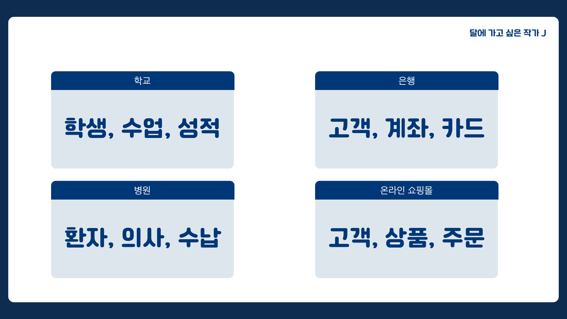 - 은행: 고객 정보, 계좌 정보, 거래, 카드 내역 등을 데이터베이스로 관리하여 빠르고 안전하게 금융 서비스를 제공합니다.