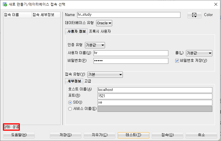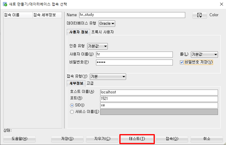 - Password: 새 비밀번호 (hr 계정의 비밀번호를 입력하세요)