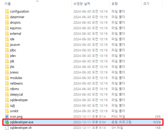 4. 다운로드 한 압축을 해제하면 sqldeveloper란 폴더가 생성되고 그 안의 sqldeveloper.exe 파일을 실행시켜 줍니다. SQL Developer의 가장 큰 장점 중 하나는 설치가 필요 없다는 것입니다. 파일을 다운로드하여 압축을 풀면 바로 실행할 수 있는 방식인데, 이를 "포터블 소프트웨어(Portable Software)"라고 합니다. 포터블 소프트웨어는 시스템에 설치하지 않고도 실행할 수 있어 간편하게 사용할 수 있습니다.