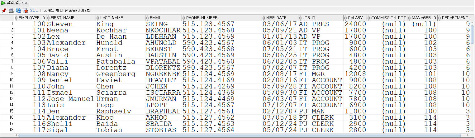 - SELECT 명령어를 사용하여 hr 계정의 데이터를 조회합니다. 예를 들어, employees 테이블의 모든 데이터를 조회해 보겠습니다.