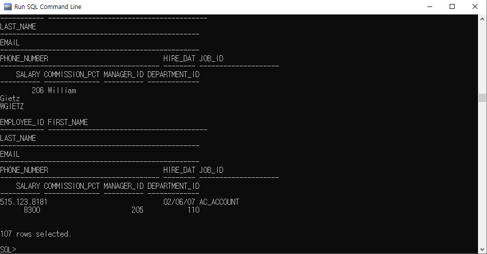 지난 시간에 hr 계정을 해제하고 비밀번호를 설정했습니다. 이제 SQL Command Line을 사용하여 hr 계정의 데이터를 조회해 보겠습니다.