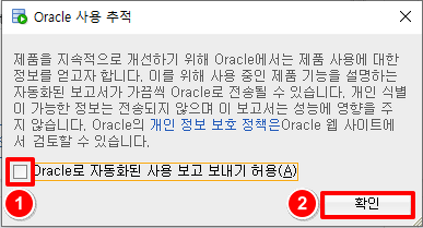 5. 실행시키면 이러한 창이 뜰 것입니다. Oracle로 자동화된 사용 보고 보내기 허용에 체크 해제하고 확인을 눌러줍니다.